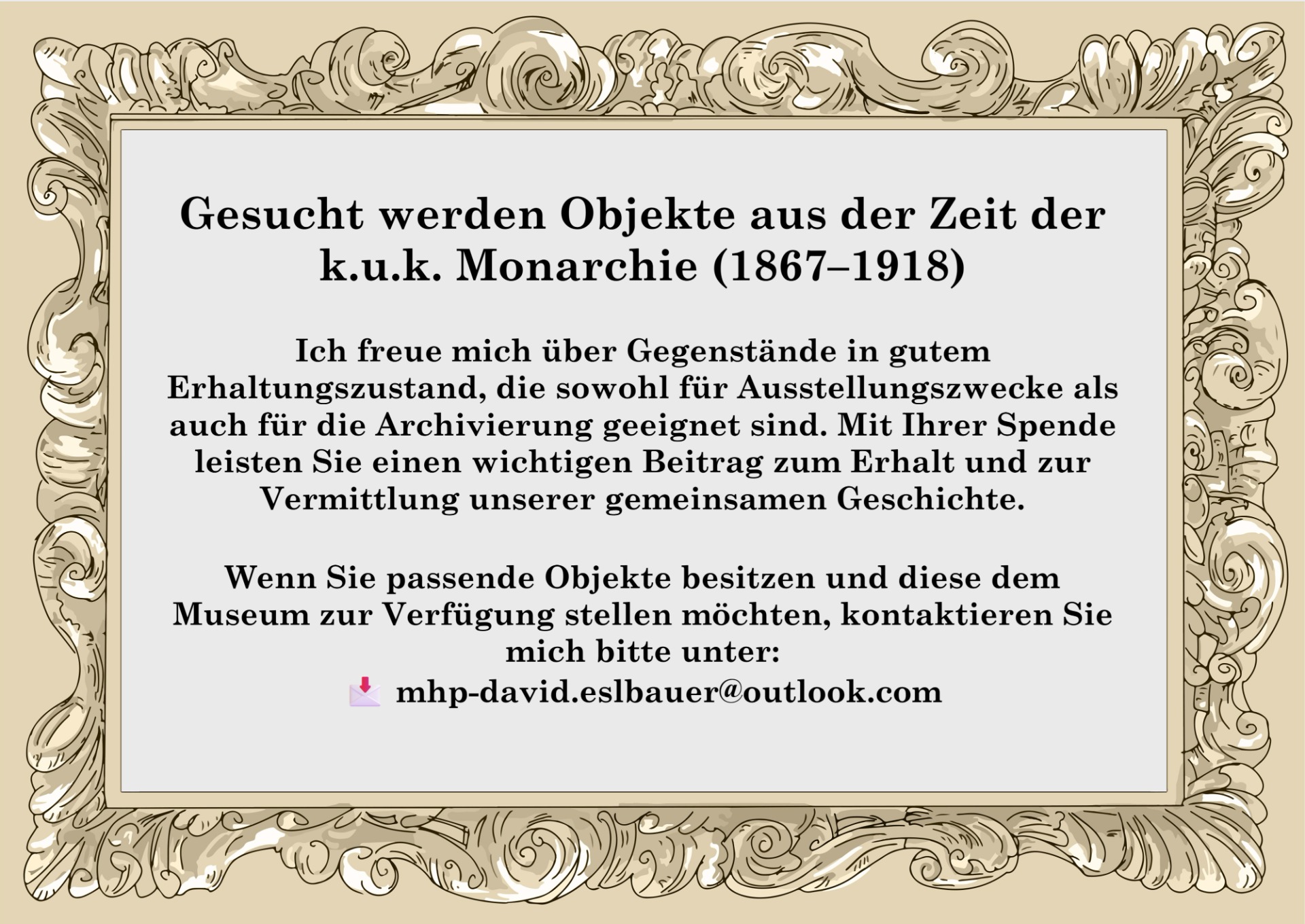 Haben Sie alte Gegenstände, Fotos, Dokumente oder Objekte aus der österreichisch-ungarischen Monarchie, die Sie nicht mehr benötigen – und wissen nicht, wohin damit? Vielleicht verbirgt sich in Ihrem Keller, am Dachboden oder im Nachlass Ihrer Familie ein Stück Geschichte. Mein Museum freut sich über Spenden und Schenkungen von Objekten, die zur Geschichte Österreich-Ungarns beitragen. Jedes Stück erzählt eine Geschichte – und ich möchten diese für kommende Generationen bewahren. Vor Ort prüfe ich, ob Ihr Objekt zum Sammlungsschwerpunkt passt. Wird es aufgenommen, leisten Sie einen wertvollen Beitrag zum Erhalt unseres kulturellen Erbes. Selbstverständlich schließen wir mit Ihnen einen schriftlichen Schenkungsvertrag ab.